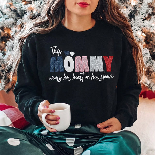Glitter Mom – Trägt ihr Herz auf dem Ärmel – Personalisiertes T-Shirt/Kapuzenpullover mit Rundhalsausschnitt, Pailletten und besticktem Spitznamen