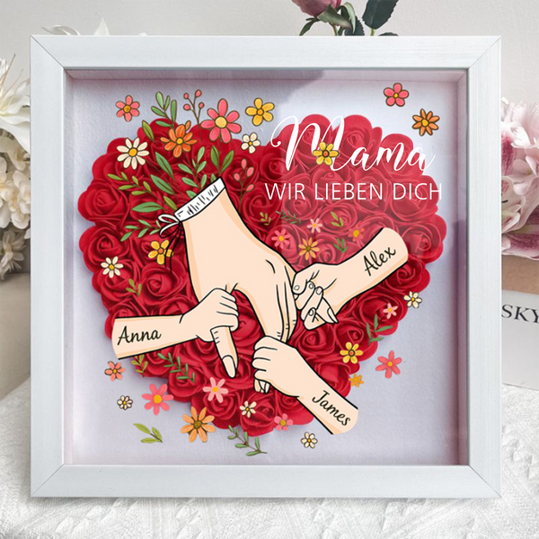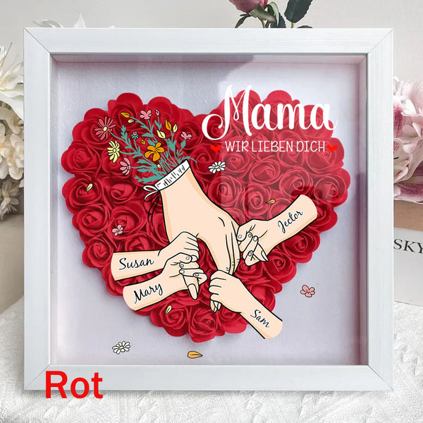 Personalisierte Schattenbox Mama hält Händchen – Individuell gestalteter Blumenherzrahmen mit Kindernamen als Geschenk für Mama und Oma