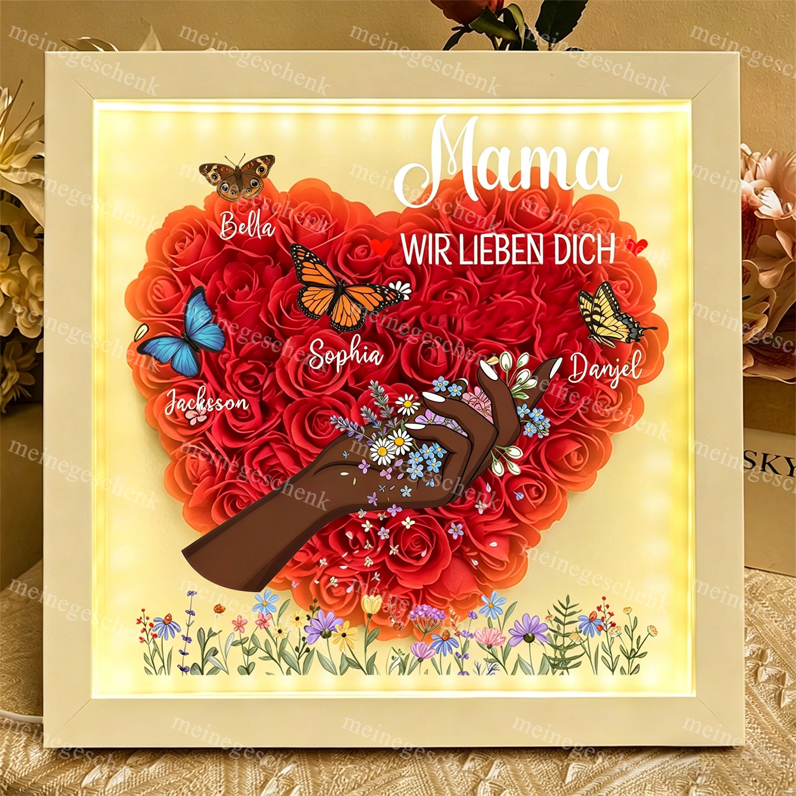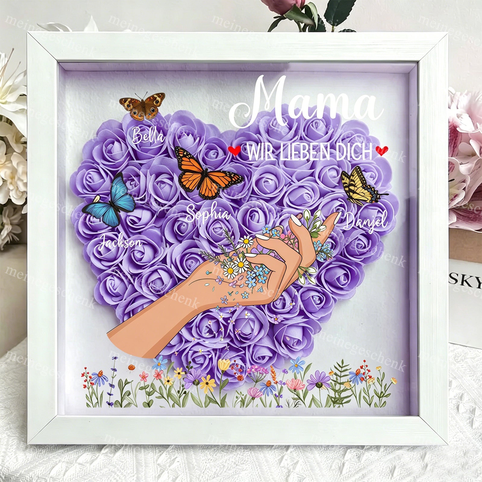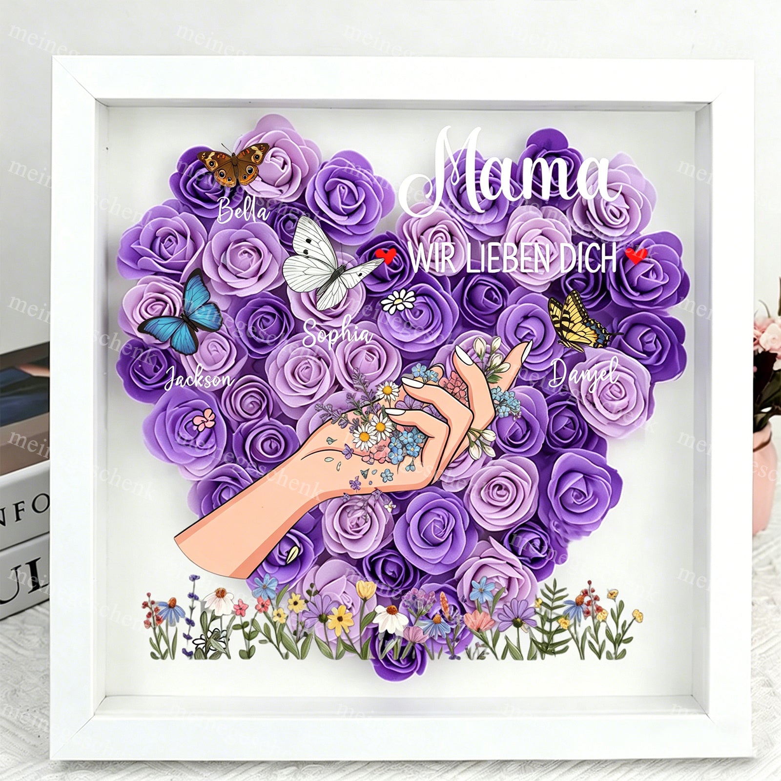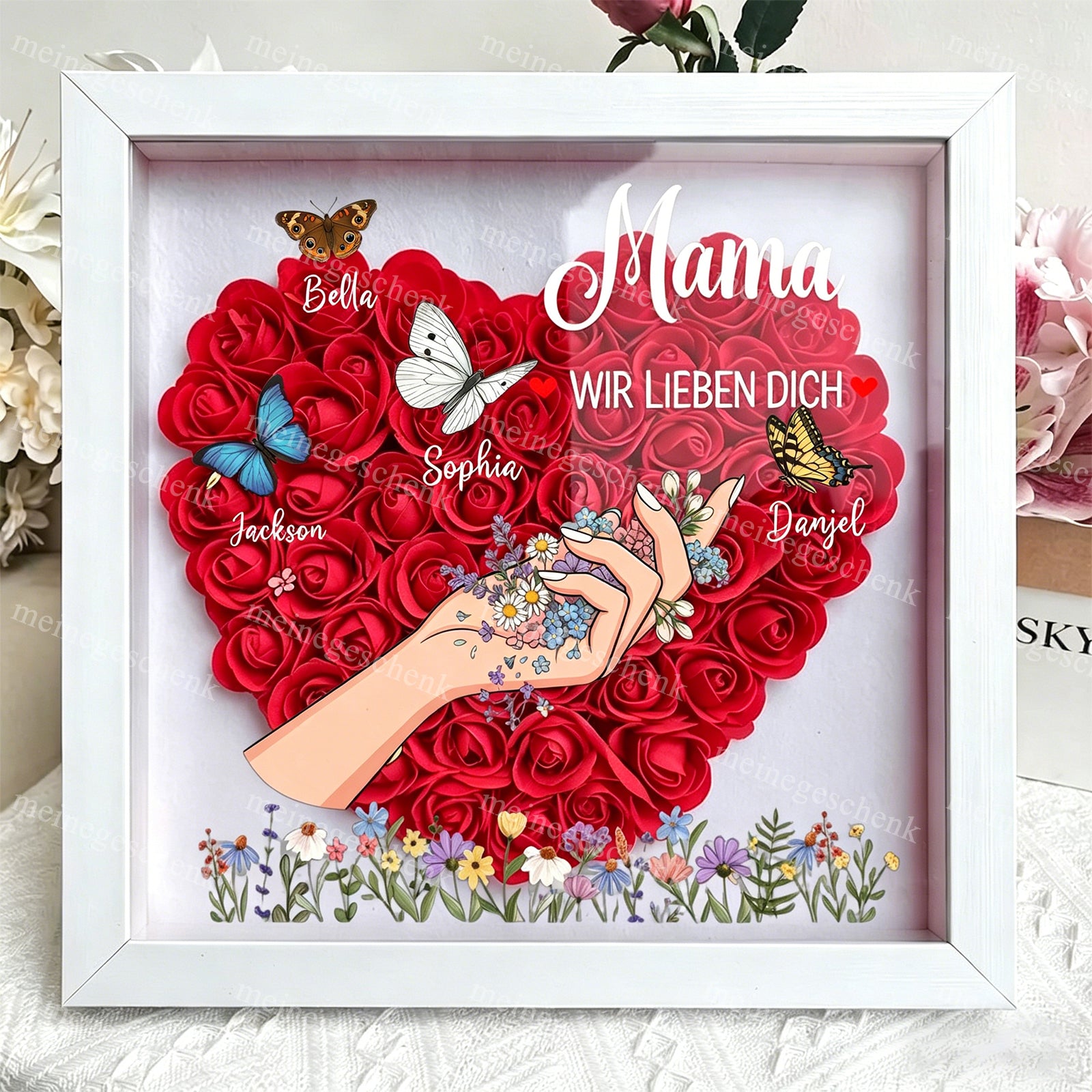Eine Liebe, die niemals vergeht: Anders als frische Blumen, die verwelken, bleibt diese handgefertigte Schattenbox für immer schön – genau wie die Liebe zwischen den Generationen. 🌹